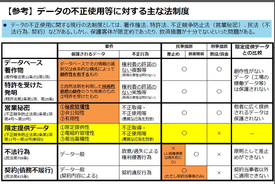 以上が従前の対応でしたが、平成30年の不正競争防止法の改正により、一定の類型のデータが「限定提供データ」として、データ自体を不正競争防止法において保護することとなりました。